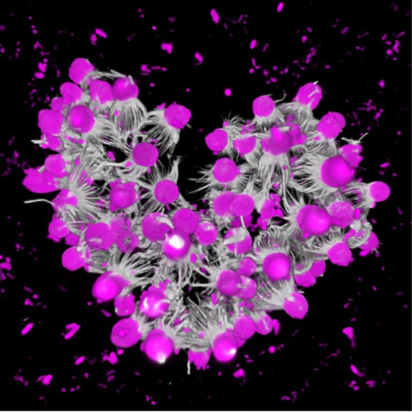 Chercheurs, étudiants et passionnés de microscopie étaient invités à révéler la complexité et l’esthétique du monde invisible à travers leurs photomicrographies à travers le concours d’images Zeiss 2025, consacré à la beauté et à la diversité des ressources naturelles observées au microscope. Parmi les 12 lauréats de cette première édition figure Núria Ros I Rocher, chercheuse au sein de l’unité Biologie cellulaire évolutive et évolution de la morphogenèse dirigée par Thibaut Brunet, qui a remporté le 1er prix du concours avec son image « Au Cœur des Origines » illustrant des colonies formées par agrégation chez le choanoflagellé Choanoeca flexa.