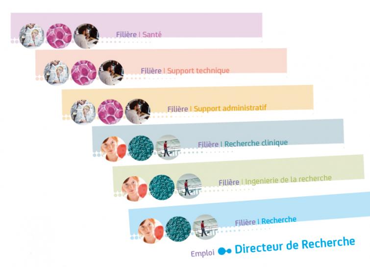 La nouvelle cartographie des emplois-types organise les emplois autour de trois familles (Recherche, Santé et Administrative & Technique) déclinées en six filières, et classe ces emplois entre les groupes et/ou échelles actuellement existants. En ce sens, elle assure une correspondance entre les anciens libellés d’emplois et ceux nouvellement créés. Le positionnement des salariés dans ces nouveaux emplois-types s’effectue donc à échelle et groupe identique et n’aura aucune incidence sur le positionnement professionnel et salarial.