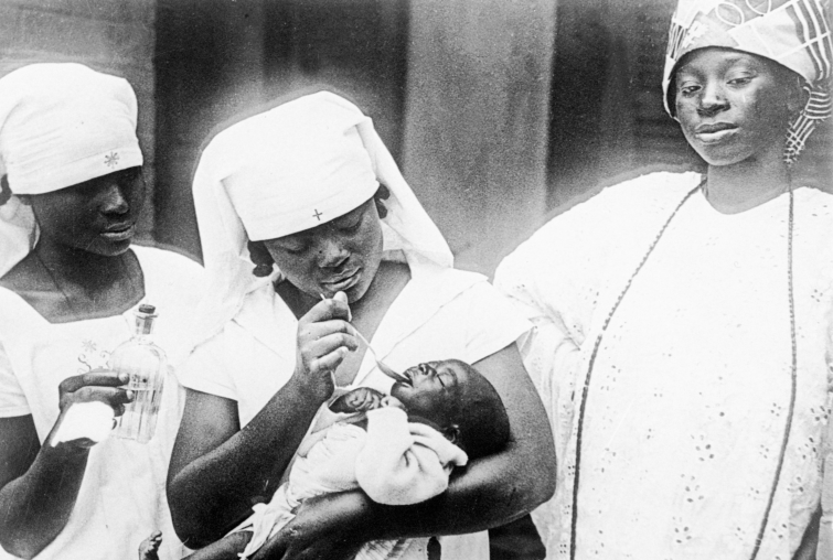 Photo : Infirmière vaccinant un bébé contre la tuberculose par le vaccin BCG à l'Institut Pasteur de Dakar en 1925.