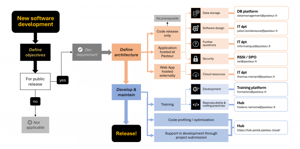 Aussi, si vous souhaitez développer des logiciels ou des outils informatiques, vous pouvez consulter le guide rédigé par le département Biologie computationnelle, le Hub de Bioinformatique et la direction des systèmes d'information, en complément de la documentation existante. Ce guide en 3 pages donne un aperçu synthétique des choses à savoir : il liste les étapes clés du processus de développement, les ressources disponibles sur le campus et rappelle les règles obligatoires et les recommandations. Ce document vise à éviter les erreurs élémentaires, à faciliter l’accès aux aides existantes et à améliorer la qualité du code diffusé par les membres de l’Institut.