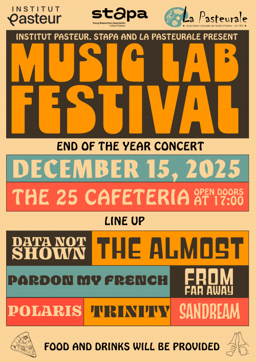 L’Institut Pasteur, en collaboration avec la STAPA et La Pasteurale, est heureux de vous inviter au Festival du Laboratoire de musique, un concert de fin d’année célébrant la musique, la convivialité et la créativité sur le campus.
